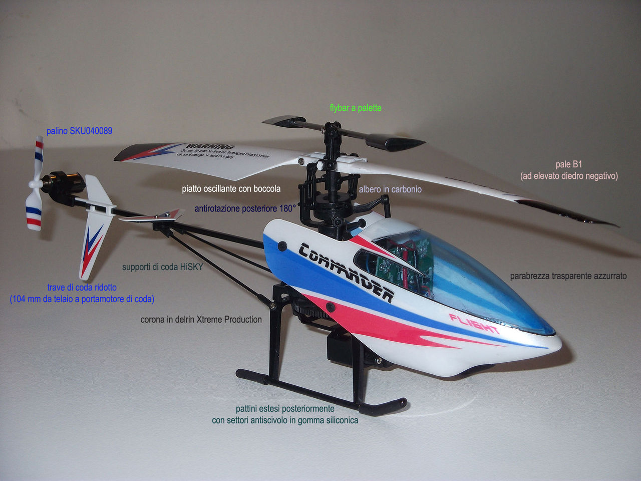 Se poi si vuole portare il V911 all'eccellenza serve altro: eliminare giochi e vibrazioni; bilanciare pale e palino; selezionare accuratamente i leveraggi tra piatto e rotore (link) specie quello inferiore, delicatissimo e facile a fessurarsi a metà, e grafitare il tutto al momento di installarli - se usata solo per lubrificare, una matita 8B o 9B dura anni. Ah, buone notizie: nelle ultime produzioni, la base del miscelatore (il pezzo centrale) è stata migliorata con la porzione a contatto con il rotore semizigrinata e leggermente a rilievo (qualche centesimo di mm) per ridurre l'attrito con la zona che circonda il perno a baionetta; stringere tutte le tolleranze quindi eliminare dagli uniball e dalle pale le bave di stampaggio. Ancora: con limetta o taglierino ridurre l'altezza del minuscolo tenone che sul braccetto di ciascuna pala del rotore impegna con la sua mortasa a fianco del foro per la vite che fissa le pale tra loro: spesso sporge troppo rispetto alla profondità della sua sede. Le due pale correttamente incastrate (per bilanciarle si provano così prima di montarle sul rotore) non devono muoversi neanche di un'inezia pena vibrazioni, TBE ("effetto sciacquone") e rottura dell'estremità del braccetto garantita in caso di urto. Rasare pure le bave circolari che a volte circondano i fori sul lato interno dei braccetti; sostituire il piatto oscillante di serie con quello a boccola ("fisheye" - anche questo va disassemblato e messo a punto onde eliminare gli sfridi tra le due metà che spesso inficiano l'escursione massima con i link sui braccetti corti). Il piatto con boccola possiede inoltre due perni antirotazione che consentono di collocarlo posteriormente anziché di sbieco, regolarizzandone il movimento; oltre ai due nuovi sistemi di fissaggio del trave di coda (a vite laterale oppure gancetto & piastrina - tipicamente quando lo ordini da BangGood arriva a caso uno dei due...) che ne evitano così l'incollaggio, ed al travetto inferiore da portamotore a portaalbero rinforzato, un'altra sottile differenza tra il telaio originale e quello del V911-1, peraltro non sfruttata nel Commander così come esce di fabbrica, è che il basamento dietro al pozzetto dell'albero su cui si innesta la forcella del perno antirotazione ha due serie di tacche per l'anellino (di serie lo piazzano a 135° a volte si scolla facilmente a volte no), quindi si può riposizionare la forcella per il perno antirotazione a 180° eliminando poi dalla base del piatto il perno superfluo; sostituire l'albero in acciaio con uno in carbonio. I miei sono cavi (quelli dei kit 'upgrade' di BangGood), riempiti con un travetto quadrangolare di noce annegato nel cianoacrilato (oltretutto il collare in dotazione a questi ultimi è nettamente più preciso e già bilanciato di suo), espediente che alla bisogna consente di chiudere i fori e riaprirli una frazione di millimetro di distanza per raggiungere le tolleranze richieste e far mordere le quattro viti nel solido anziché alle due pareti di un tubo cavo (soggetto a sfibrarsi e/o fessurarsi, mCP X docet...). Non si direbbe, eppure giova perfino bilanciarne la rotazione ponendo le quattro viti (flybar-testa e collare-corona) perfettamente a 180° tra loro (occorre comunque spostare il foro per la vite che fissa la corona) e ancor più eliminare del tutto i giochi assiali tra collare e cuscinetto superiore come pure tra corona e cuscinetto inferiore; garantire il perfetto accoppiamento tra pignone e corona: tra quelle di serie (bianche) in media su dieci ne ruota in piano la metà; adattare bene la sede del motore principale: se l'accoppiamento è lasco il pignone può saltare qualche dente della corona usurandola, se troppo stretto si riducono i giri e si usura anzitempo il motore. Inoltre, siccome alcune corone oltre che essere sbilenche ruotano leggermente fuori centro, incluse le Xtreme in delrin, spesso occorre calcolare la media dell'errore e adattare il tutto fresando l'interno della sede del motore per disassarlo impercettibilmente, oppure aggiungere striscette di nastro - spesso entrambe le cose; modificare la slitta del carrello onde riposizionare la batteria all'interno della cabina per correggere il centro di gravità. Infatti di serie l'eli è cabratissimo: accettabile in hovering ma vergognosamente singhiozzante nel volato. Quest'ultima attitudine si corregge in gran parte sperimentando con lunghezza, peso e inclinazione dello stabilizzatore, non prima però di aver ottenuto un perfetto bilanciamento statico; sostituire la flybar a pesi di serie, buona per imparare ma alla lunga penalizzante, con una a palette magari accorciata ed alleggerita secondo gusto ed esigenze personali. Ottima l'«upgrade flybar» acquistabile da BangGood e Aliexpress ma occhio: quella venduta singolarmente su BangGood, nero opaco, è un ricambio per il Benma Helios 100. Mozzo e uniball non sono compatibili con la testa dell'albero del V911 quindi occorre procurarsi quella venduto in kit con albero in carbonio e piatto boccolato, in policarbonato translucido color grigio-violaceo. Ad esempio, l'elicottero in foto monta una WLtoys da 115 mm a palette pesate che uso solo per volare dentro casa. All'aperto ne monto alternativamente due, entrambe autocostruite: per le evoluzioni uno da 78 mm, barra WLtoys standard accorciata con pesi da 6 mm (2ª serie) mentre per il volato veloce una da 102 mm, barra WLtoys 'upgrade' e palette Benma con pesi sostituiti da una colata di resina cianoacrilica a raso con la faccia inferiore. Citazione: