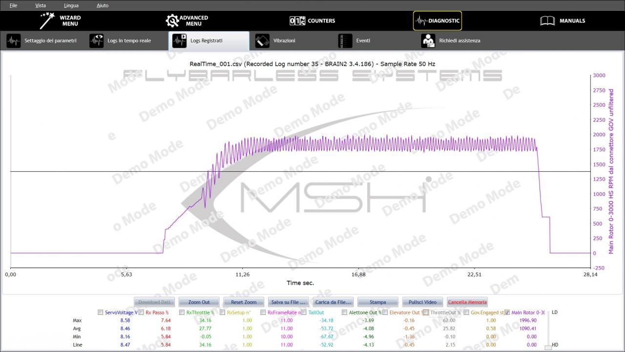 Buongiorno a tutti del forum, dopo le info ricevute nei post precedenti e dopo: 0) Montaggio elicottero 1) Setup ESC per governor esterno 2) Setup Brain2 base by Wizard 3) Setup radio Radiomaster by wizard Brain2 4) Riverifica e cambio valori Brain2 secondo datasheet di Jonas Ho provveduto accendere il motore dell'elicottero senza pale e palini per vedere se tutto era ok e ho riscontrato le seguenti cose che non so se è normale: 1) Quando avvio in Normal, il motore parte dopo circa 10 sec 2) Poichè è attivo il Governor con tre velocità ho un effetto che non so se è normale ossia la velocità del rotore raggiunge la velocità di rotazione e poi inizia a variare a singhiozzo tant'è che la coda scodinzola inizialmente di brutto poi man mano si riducono queste variazioni. In modalità IdleUp1 non si vedono differenze di velocità ossia non si porta alla velocità impostata anche se diventa verde il setup. In modalità Idleup2 c'è un aumento elevato di giri ma riparte lo scodinzolamento e il singhiozzo. La velocità si porta al valore impostato In passato, con lo stesso Hely e un'altra centralina con ESC (quest'ultimo in modo Hely-Gov) e con la radio impostata con curve dritte ossia con valore fisso secondo tabelle manuale, c'era solo lo scatto iniziale e poi finiva li e la velocità rimaneva costante e la velocità cambiava tra normal e idleup1 e tra quest'ultima e idleup2 senza strappi. Allego una registrazione di log, graficamente sembra che i valori provenienti dal esc sono come ballerini e di conseguenza (credo) anche la risposta del Brain 2 è repentino. Ho controllato le letture con il SW del Brain e l'Idleup2, sebbene si attiva, il visualizzatore di giri rimane pressocchè uguale (ballerino ma uguale) Mi sono perso qualcosa ? Questa è la prima volta che uso il governor gestito dalla centralina e non dal ESC quindi scusatemi se chiedo se è normale il funzionamento. Con gli eli ho imparato che prima di metterlo in volo bisogna controllarlo certosinamente. Una nota che la dico è quella della centralina che non è ancora fissata con il biadesivo ma è ancorata con fascette ed è ferma, anche in passato ho provato senza pale e fissando la centralina ben salda alla base con fascette senza problemi. Grazie per la pazienza e per aver letto, ancor di più se mi potete aiutare. Saluti cnesan |
