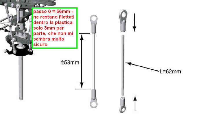========= SITUAZIONE: radio tutti trim subtrim a zero stick a metà passo pale (entrambe in tutti i punti cardinali) = 0 gradi spaccati stick 0 = passo -6 stick 100 = passo +6 piatto in bolla quasi perfetta da 0 a 100 di elevatore. Ora mi resta di fare le curve giuste per i miei pollici artritici ![]() visto che a 100 ho solo +6 suppongo che devo aumentare il travel del servo (molto basso come lo avevo messo per il setting sballato di prima). (e mi vado a rivedere i post sopra per i consigli sulle curve da impostare) ........al prossimo aggiornamento ![]() =========== P.S. dove trovo occhielli per questi link e per questi uniball con gambo internamente filettato + lungo? | |