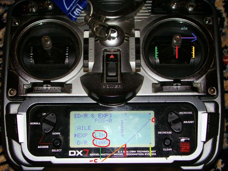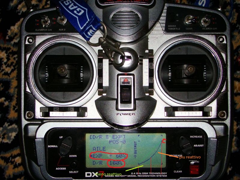 Le curve del passo ciclico: cosa sono e a cosa servono per un principiante. Nel grafico (vedi foto), abbiamo una curva su un asse cartesiano. Qui possiamo immaginare la risposta del ciclico rispetto al comando dato sullo stick. questa curva è definita in base alla relazione tra lo spostamento dello stick e l'angolo reale (risposta) del passo ciclico. Mostro una immagine per aileron (alettoni) dove tra le linee con colori e spostamento di stick e su asse verticale e angolo o c. Come si vede grafico visto in telecomando e per meta corsa stick Dal centro verso destra otterrò un certo numero di gradi positivi C. La corsa dal centro verso sinistra è la stessa, con la differenza che i gradi di ciclico sono espressi in negativo. In parole povere potremmo agire sul ciclico per ottenere un modello meno reattivo in risposta ai comandi di cabra e picchia rispetto ai comandi sulla curva aileron. Questo perchè in genere a chi inizia interessa un modello meno reattivo e quindi più facilmente gestibile. Penso che consigliato sara a lasciare curva lineare e riddure il valore del ciclico dopo quanto serve. in questa foto, con c/3 si ha ancora meno reattività In tal caso il modello, essendo meno reattivo, perdona un pò più eventuali errori Man mano che si fa pratica con il modello vedrete che verrà automatico voler aumentare la reattività dello stesso. Infatti, man mano che si acquista dimistichezza, la sensibilità dei pollici aumenta. Nel momento in cui si desidererà una reattività elevata, in particolare per volo sport, acrobatico o 3d, potrete impostare l'esponenziale in positivo. Attenzione: nell'esempio è raffigurata una radio spektrum, ma è importante dire che il valore negativo o positivo degli expo a seconda che si voglia un modello più o meno reattivo può variare a seconda del radiocomando utilizzato. La prassi è di regolare prima di tutto il passo ciclico necessario e, solo successivamente, agire sugli esponenziali a nostro piacimento. E' buona norma utilizzare le stesse curve sia per alettoni (rollio) che elevatore (nick, picchia/cabra).