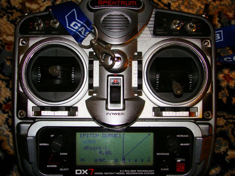 Impostazione delle condizioni di volo (curve passo collettivo e giri motore) Nel caso del mio radiocomando (Spektrum Dx7) avrete a disposizione 4 condizioni di volo. (il numero delle curve disponibili può variare a seconda della radio in vostro possesso). -normal: Di norma si imposta questa condizione in modo che con lo stick del gas al minimo il rotore sia fermo. Per far ciò, va impostato un valore 0 nel primo punto della curva gas. Ricordiamo che questo non è sempre vero in quanto si potrebbero impostare valori diversi. Tuttavia, per un utilizzo da parte di principianti, andrebbe impostata con zero al primo punto. In genere questa curva potrebbe essere utilizzata anche per un collaudo oppure per la fase di spool up (quando si inizia a far girare il modello prima del decollo) per poi passare ad un'altra condizione di volo. -Idle1 : utilizzata in genere per volo Sport/Acro. Di norma la si utilizza con motore sempre attivo (niente zero al centro) ma con meno giri e con meno gradi di passo negativo rispetto ad una curva da volo 3d. In genere si utilizza questa curva per un volo appunto sportivo, volato veloce, loops, tunneaux, stall turns. Il motore, essendo sempre attivo (non definiamo un punto a zero sul gas) deve essere fermato impostando il normal in atterraggio. Ricordiamo che, anche in questo caso, abbiamo definito le curve secondo una certa convenzione, ma nulla vieta di poter fare una curva gas con punto zero al minimo o addirittura una curva 3d anche in idle1. -idle2 : utilizzata in genere (convenzione) per volo 3D. Passo collettivo degli stessi gradi sia in positivo che in negativo, motore ad alti giri su tutta la curva gas. Anche per questa modalità, chiaramente, vale ciò che è stato scritto a proposito della Idle1: per spegnere il motore bisogna tornare in normal ed è possibile configurare la cuva a nostro piacimento. -Hold: in questa fase di volo il motore viene impostato a zero, ossia con una curva gas piatta con valore 0 per tutti i punti. Possiamo considerarla appunto come un blocco motore. La curva del passo è regolabile a nostro piacimento. Questa condizione di volo è utilizzata per effettuare la cosiddetta autorotazione, una manovra che nei modelli RC può essere utilizzata come azione d'emergenza. E' da tenere presente che in caso di guasto del modello, qualora esso dovesse cadere in IDLE (motore costante) i danni potrebbero essere elevati. Dunque, grazie all'Hold è possibile togliere motore cercando di limitare i danni. N.B: Poco sopra abbiamo detto che qualora si voli in IDLE è opportuno tornare in Normal prima di atterrare e spegnere l'elicottero. Nulla vieta di utilizzare l'Hold, magari effettuando un'autorotazione voluta, che fa sempre bella scena ![]() In certi casi, in particolare se utilizzate determinati regolatori elettronici (ESC) provvisti di governor è addirittura consigliabile non volare mai in Normal ma partire sempre in IDLE (e tenendo fermo il rotore accendendo il modello direttamente in HOLD) Iniziamo a fare il settaggio delle curve come in foto (dal manuale del radiocomando )