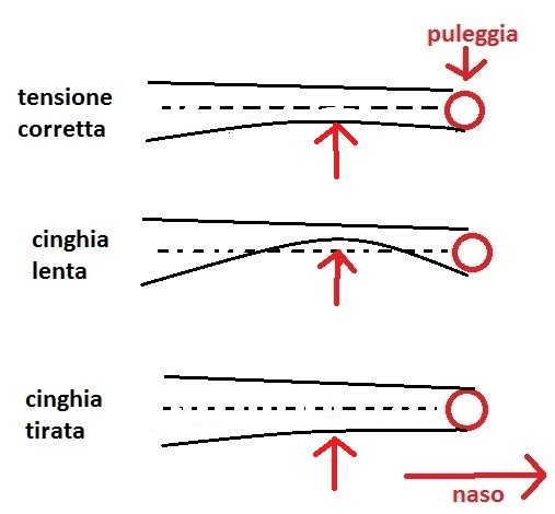 mi è venuto in mente se potrebbe essere la tensione della cinghia, come la vedo?ho trovato questa immagine, la tensione la controllo sulla puleggia anteriore(tra la puleggia e l'inizio del tubo) e spingendo un lato della cinghia non deve superare la linea di unione tra le due parti del telaio?