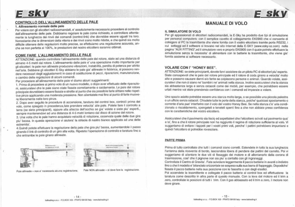 Grazie a tutti per la prontissima risposta...appena riesco a provarlo vi tengo aggiornati. Purtroppo dopo il primo volo disastroso ho piegato il perno centrale che collega le pale al rotore, ma sono riuscito a raddrizzarlo senza sostituirlo (anche perche é introvabile da solo...). Questo perno secondo voi, piu causare problemi se é leggermente storto? In ogni caso quando é arrivato in scatola chiusa, era completamente fuori settaggio, altro che pronto al volo...ora ho regolato tutti gli uniball dei servi a 2.5 cm in modo che il piatto é perfettamente diritto rispetto al suolo e i trimm sono in posizione centrale. Poi l'IDLE UP lo ho regolato in posizione centrale, in modo che accelarando il piatto sale, e decelerando il piatto scende alla stessa misura sull'asse. La levetta in altro a destra sul radio a cosa serve che non trovo nulla sul manuale? p.s tra l'altro per il munale ho dovuto scaricare quello del modello blade cp pro, in quanto quello del HB CP2 non lo ho trovato da nessuna parte ne in italiano ne in altre lingue...Grazie mille ALAN |