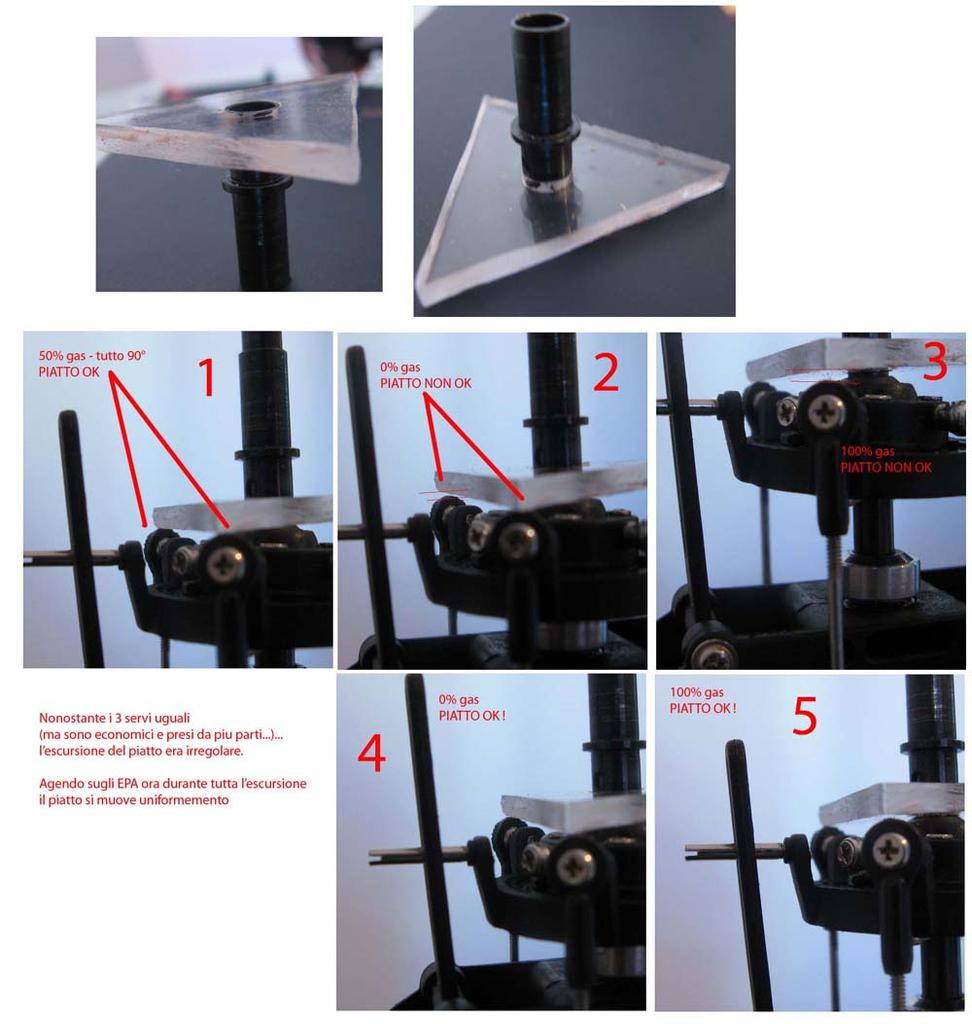 Ringraziando Veleno71 che spesso ci illumina con le sue dritte e prendendo spunto da un post di un altro thread... vi posto quanto emerso dall'utilizzo del tool in oggetto che praticamente vi permette di controllare se durante tutta l'escursione del piatto esso sale/scende in maniera uniforme. Il tools l'ho fatto in un quarto d'ora usando un pezzo di plexiglass (ho fatto un triangolo equilatero da 4 cm per lato) e il perno in cui si inserisce il cuscinetto unidirezionale. I risultati li vedete nelle foto: foto 1 - piatto livellato con 50% di gas e tutta la meccanica a posto (servi a 90°, mixer, paddle arm.... e resto). foto 2 - gas 0%, il piatto non è sceso uniformemente, notate le 2 linee rosse orizzontali a sx foto 3 - gas 100%, il piatto non è salito uniformemente, notate le 2 linee rosse orizzontali, questa volta a dx Ho agito allora sugli EPA (o travel adjust) regolando l'escursione dei servi che pur essendo uguali (sg90) evidentemente non hanno la stessa corsa (li ho presi qua e là... e quindi chissà da che fabbrica provengono) foto 4 - gas 0%, il piatto è sceso uniformemente foto 5 - gas 100%, il piatto è salito uniformemente Provero' la stabilità quando il tempo lo permetterà.... ![]() Grazie ancora a Veleno per lo spunto... CIAO