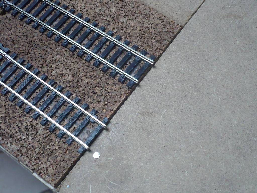 2 binari si "gestiscono" con la scarpette, 4 no. Io li posiziono e li incollo direttamente sul sughero dopo aver preso bene le misure. Prima da un lato.... Poi dall'altro.... E' evidente che, così facendo, non c'è contatto tra i binari e quindi occorre dare corrente ad entrambi i moduli. Le tecniche sono molte. Tra le varie anche quella di saldare nella parte sottostante e terminale del binario il filo stagnato. E' una tecnica che non mi piace in quanto con il tempo potrebbero sembre esserci degli assestamenti ed in questo modo non si possono più "muovere" i binari. Preferisco semplicemente incollarli sul sughero e lasciare la parte terminale "libera". Ciò mi da la possibilità di alzare o abbassare in misura millimetrica la parte terminale del binario qualora dovesse essercene il bisogno. Per la saldatura uno un saldatore da 25w ed un filo stagnante. Se si vuole evitare di saldare si può far passare il filo sotto la traversina, appositamente tagliata con il cutter e forzandolo in modo che sia a contatto con il binario.