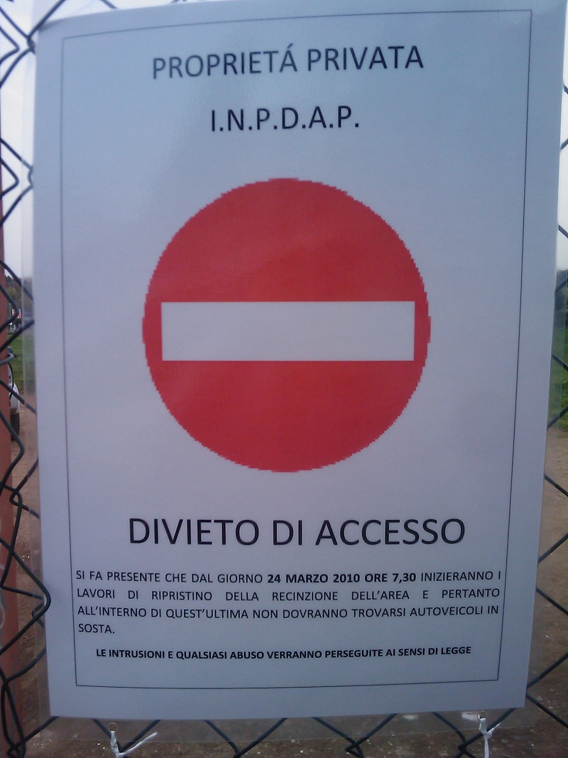 All'ingresso del campetto è apparso un sinistro cartello che, sotto la dicitura INPDAP e un segnale di divieto d'accesso, informa che "Si fa presente che dal 24 marzo 2010 alle ore 7,30 inizieranno i lavori di ripristino della recenzione dell'area. Le intrusioni e qualsiasi abuso verranno perseguiti ai sensi di legge" Non è che gli intrusi siamo anche noi? Che facciamo? |