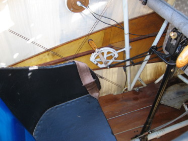Il termoretraibile costa certo meno ma non presenta i vantaggi del Dacron e, se usato male, può causare gli stessi danni. In compenso, se riesco a rivestirlo col Dacron avrò un modello più robusto e duraturo. Altra scoperta: tra i pezzi presenti c'era da ricavare dal sottilissimo compensato utilizzato per la realizzazione del sedile del pilota due piccole strisce di materiale a forma di settore di circonferenza larghe circa 8 mm. Al solito non riuscivo a capire a cosa servissero. Su una tavoletta di compensato più doppio c'erano quattro piccoli settori di cerchio di due misure diverse larghe 1 mm. Studiandone la forma per capire a cosa potessero servire la mia mente ha collegato i sei pezzi tra di loro, ho verificato ed ho capito. Incollando su ciascuna striscia di 8 mm i due pezzi più stretti si ricavano due piste che sono in effetti i battitacco posti sul pavimento della cabina accanto alla pedaliera del controllo timone. Assurdo! Tanta grossolana semplicità ed alla fine scopri che hanno inserito un particolare che, ad aereo finito, sarà quasi invisibile a meno di ficcare il naso in carlinga. Per interderci nelle due immagini allegate la vista del posto di pilotaggio mostra, sulla destra uno dei due particolare mentre nel disegno tridimensionale dei comandi di guida sono evidentissimi sul pavimento. | |