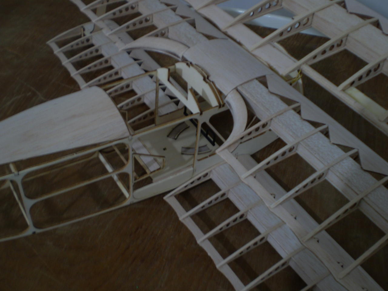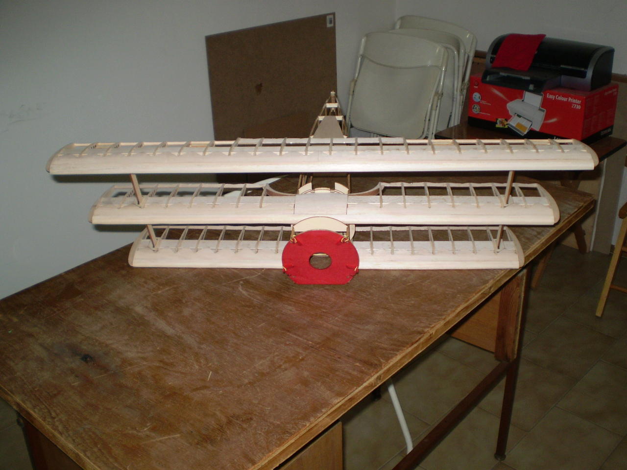 Qualche immagine dell'ignobile Fokker! Nelle foto compare il modello premontato senza i particolari interni (sedile pilota e leva controllo) senza alettoni, senza piani di coda né timoni e logicamente senza il rivestimento. Il cofano motore non è montato perché appena verniciato mentre il firewall, già verniciato, è tenuto in sede con elastici in attesa di montare i servocomandi e poi chiudere. |