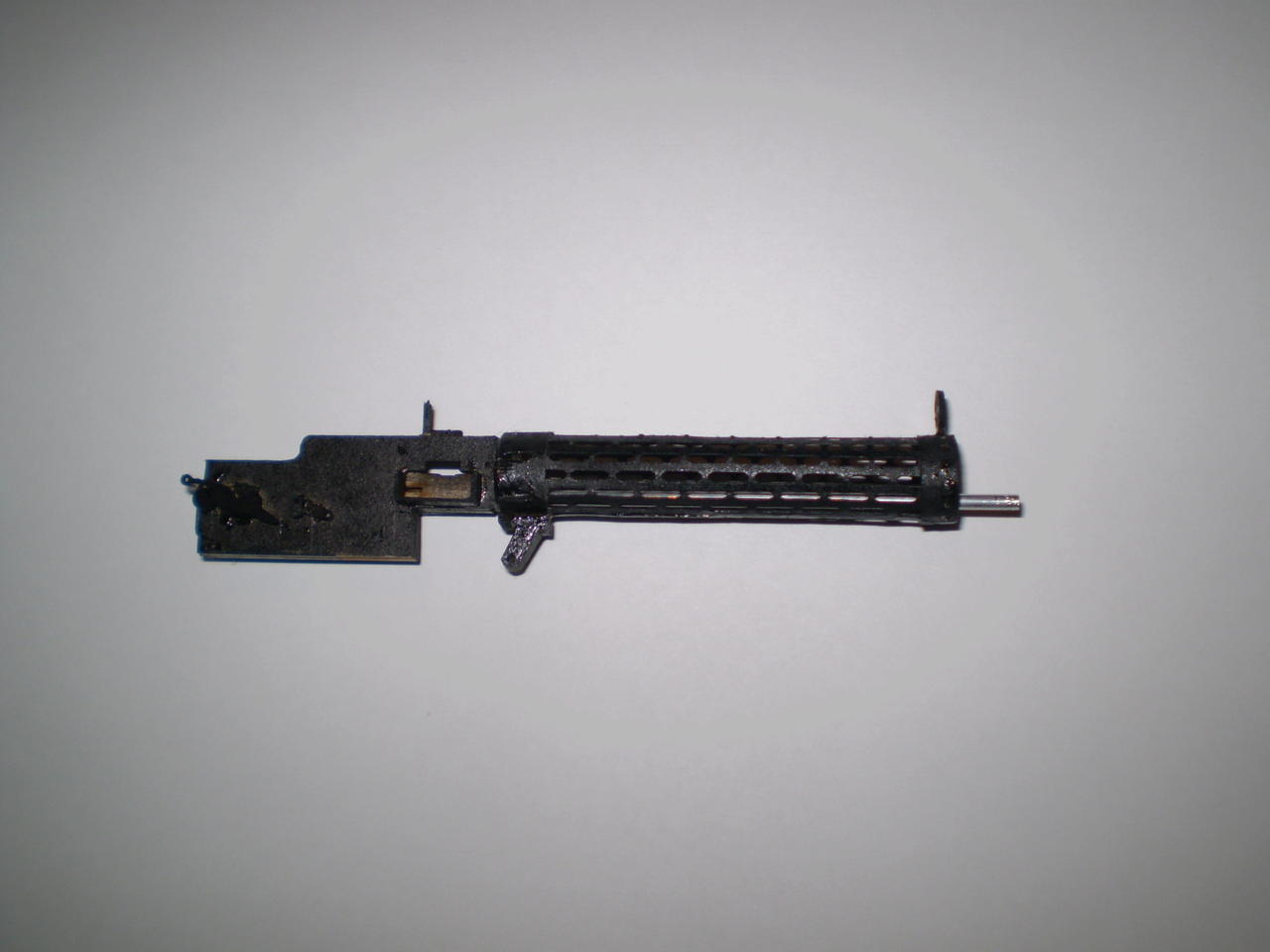 ...ammirate quanto è sfiziosa questa mitragliatrice...E' composta di ben 37 pezzi ed il radiatore è di carta! gli altri particolari sono in legno e la canna in alluminio. Misura in tutto 12,5 cm ed è vernicita con vernice nitro nero lucido. Sai che figura farà montata insieme alla gemella sull'aereo? |
