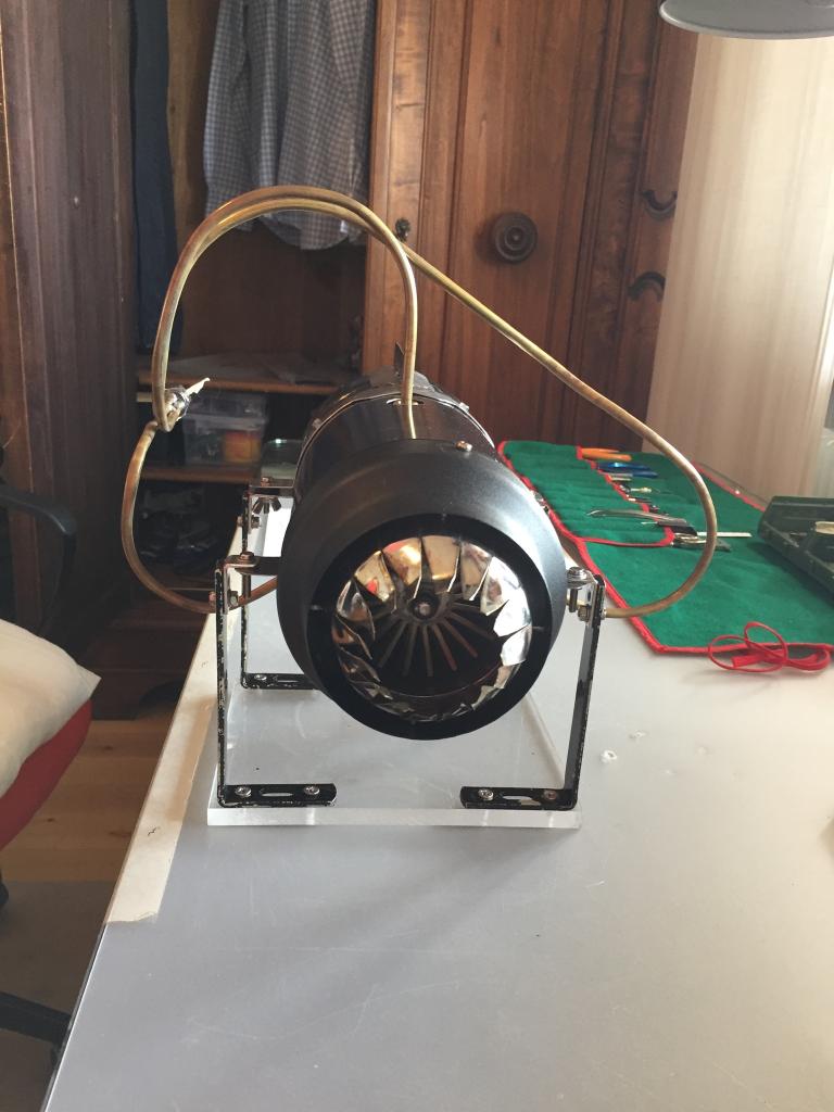 Innanzi tutto ringrazio per la tempestiva risposta. In realtà il motore funziona bene se applicato a un carico piccolo, in fatti emette il giusto numero di suoni e ruota correttamente anche a velocità elevate; il problema nasce accoppiandolo con il carico dell’asse della turbina, infatti, in questo caso, dopo non più di un paio di giri si blocca emettendo stridori orribili (sembrerebbe evidente che sia troppo sottopotenziato e faccia effettivamente fatica a far girare l’asse). In effetti, essendo un progetto completamente handmade e per quanto abbia fatto tutto il possibile per centrare e calibrare l’asse, è inevitabile la presenza di imperfezioni di centratura che sommato all’inerzia dei rotori (non trascurabile essendo di acciaio 1mm per compressore e 1,5mm per turbina) crea una coppia resistiva a mio dire abbastanza elevata (CR~0,025 Nm). Allego sotto qualche foto del progetto: |