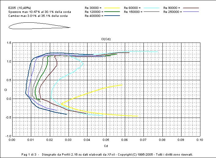 Chi mi spieg come leggere i seguenti grafici? Profilo scelto Eppler 205 spessore al 10,48% modificato al 13% prima aumentando solo l'estradosso, poi aumentando estradosso ed intradosso simmetricamente sino al 13%. Ecco i risultati: Grazie!