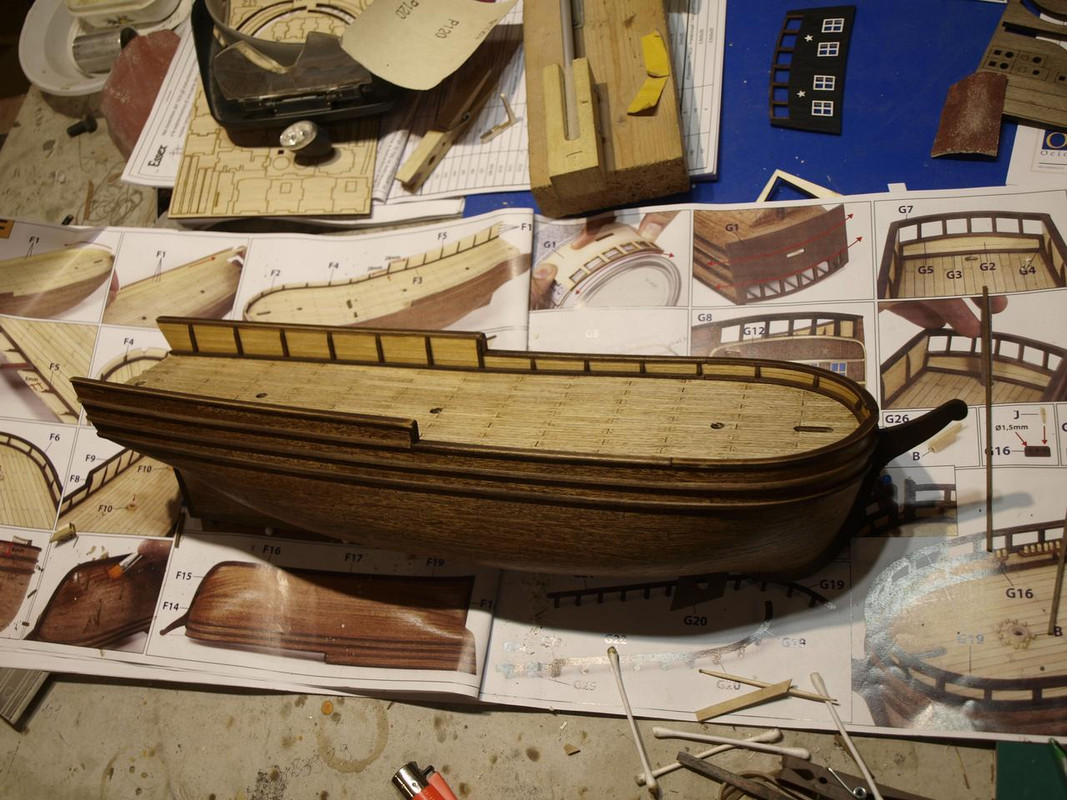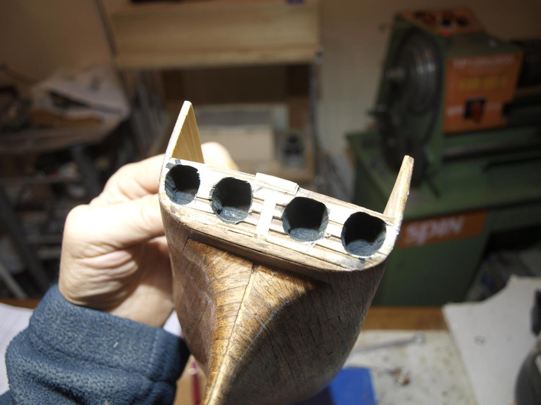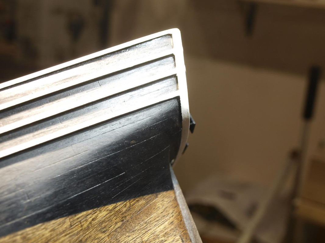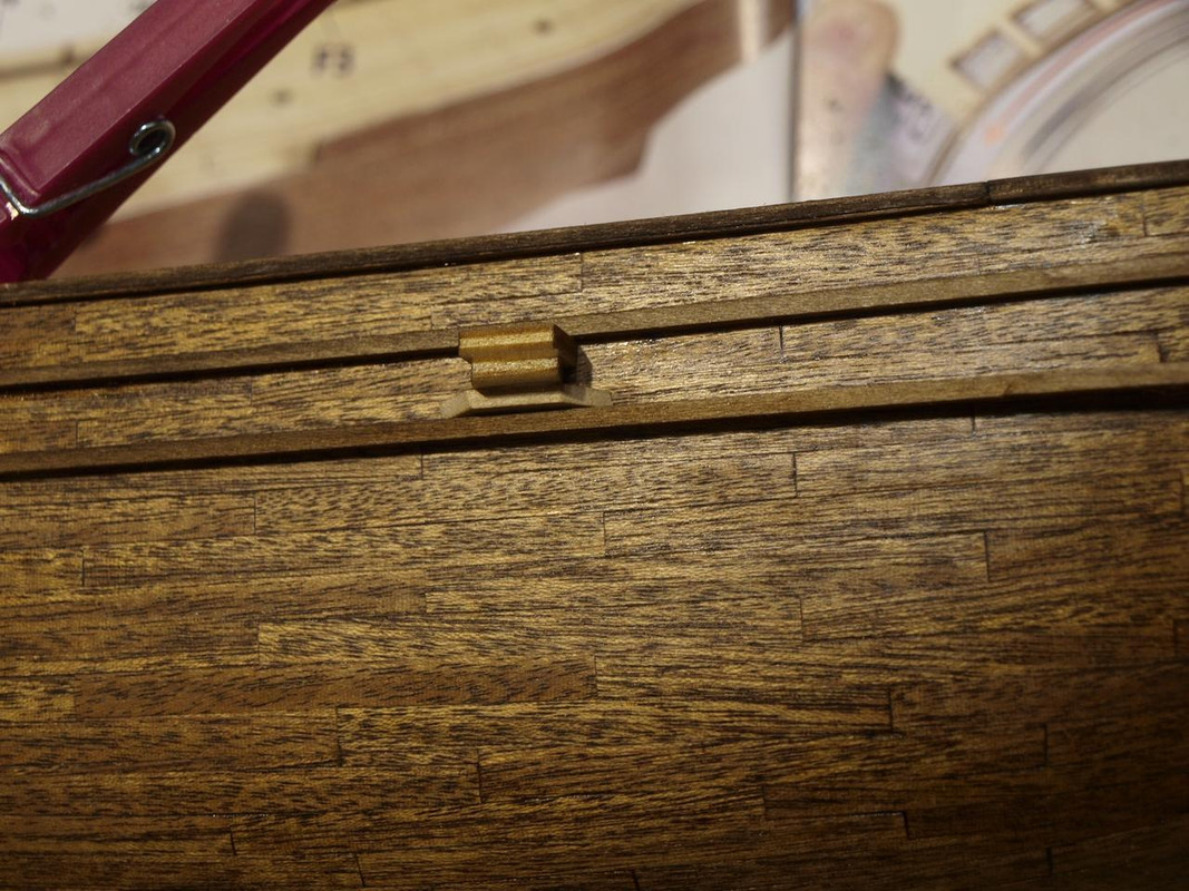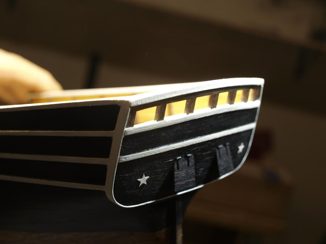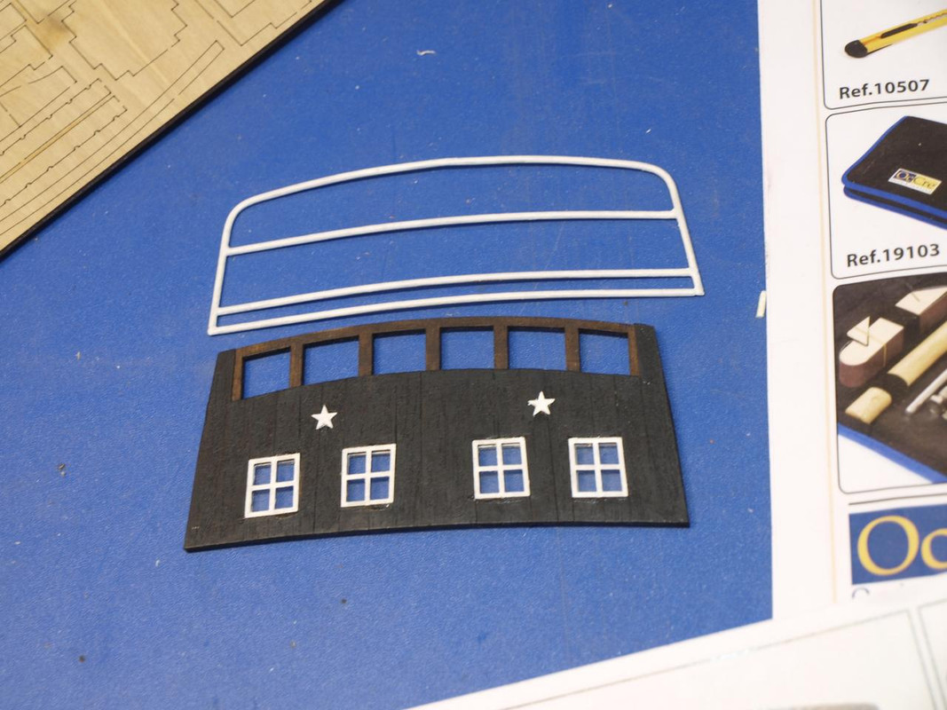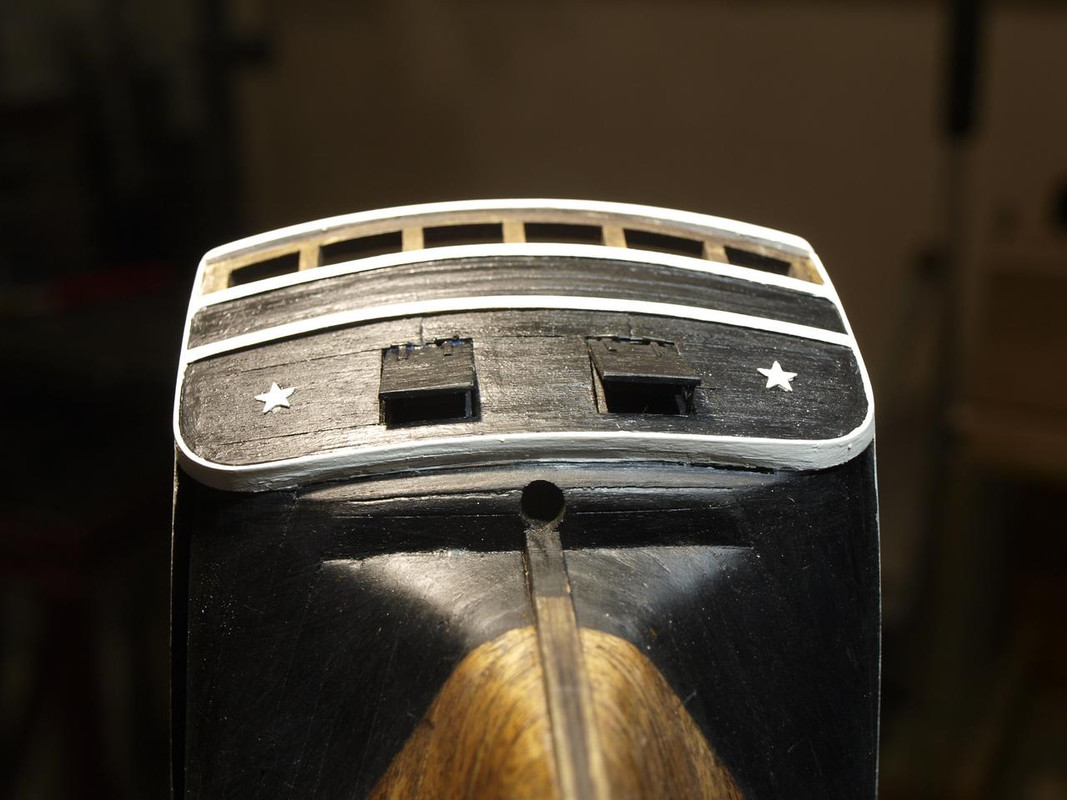 Bellissima, mi piace molto il finto fasciame fatto a pezzettini ... È molto realistico e poi la finitura in gommalacca .Come mai, dopo tutto il lavoro extra delle finestre hai deciso questa modifica radicale allo specchio di poppa? Hai trovato documentazione per farla "diversa"?