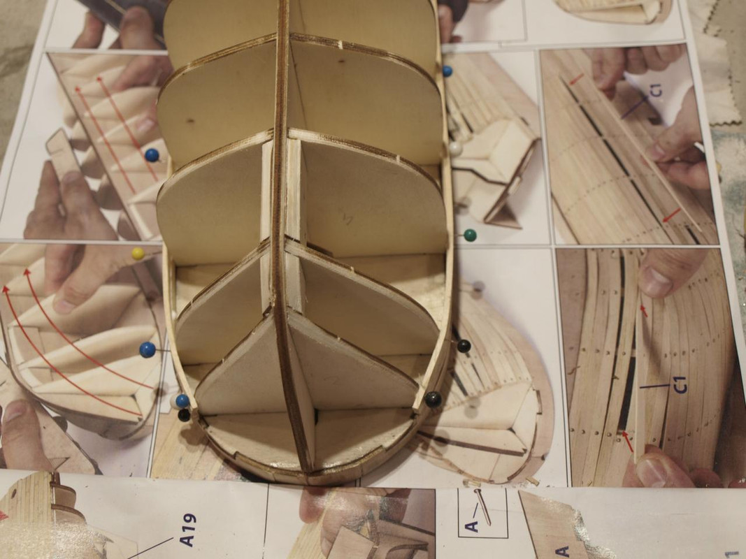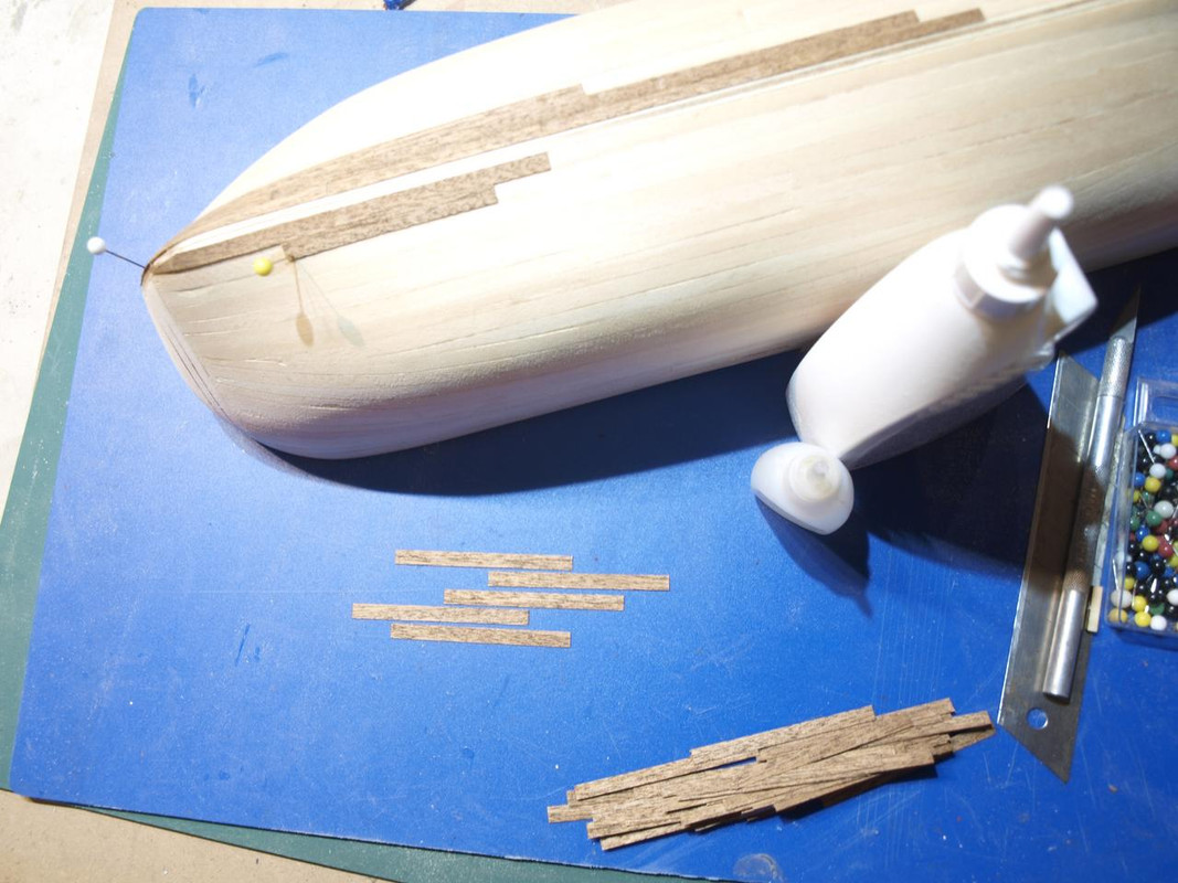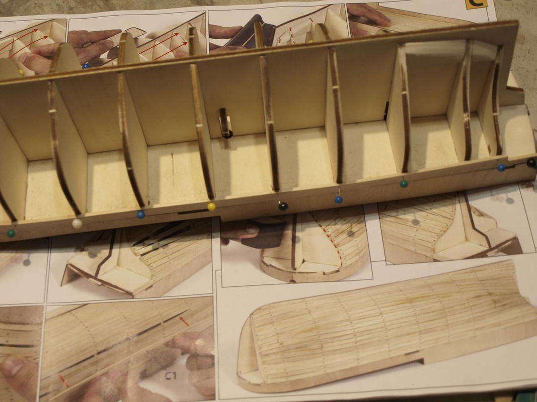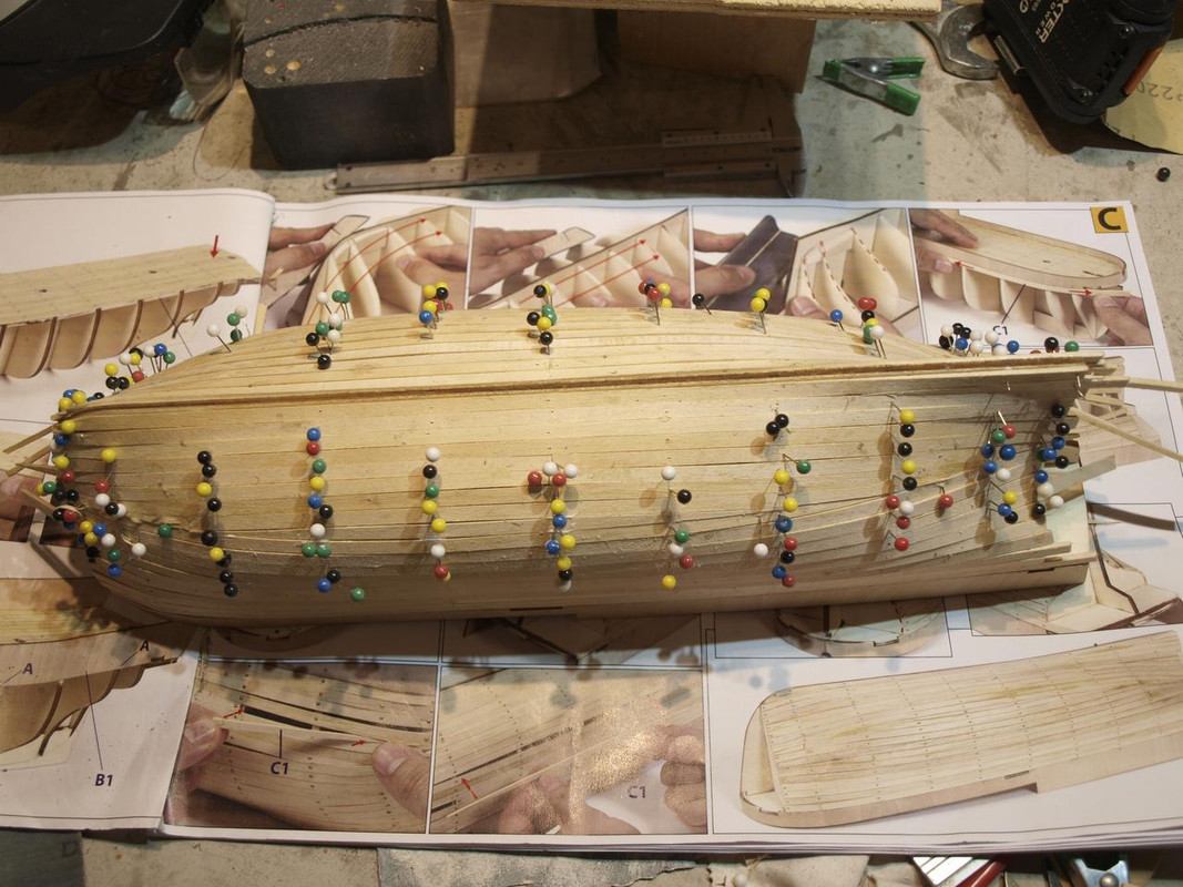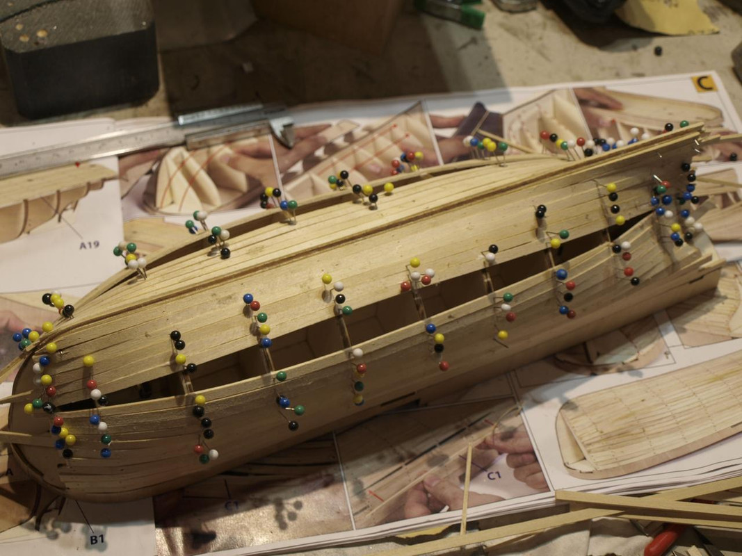 Ho iniziato a chiudere lo scafo col primo fasciame. sto evitando di mettere i chiodini d'ottone come indicato nelle istruzioni. preferisco usare i miei spilli che poi posso rimuovere, in questo modo mi evito il rischio di formare delle dune in corrispondenza dei chiodi quando avrò da scartare la superficie ![]() |