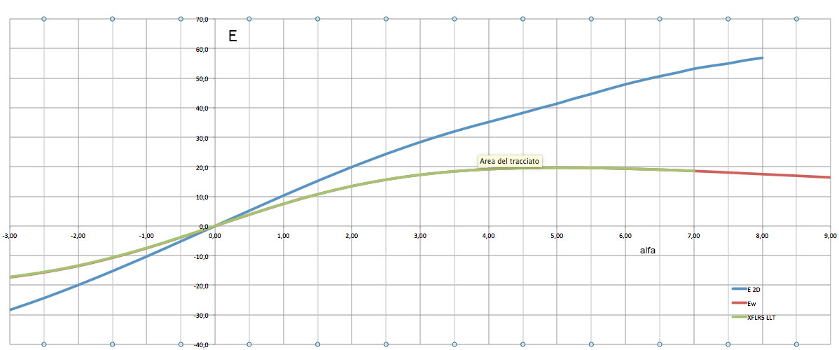 Buongiorno a tutti. Tempo fa scrissi un foglio di calcolo che ricavava la polare di un'ala ad allungamento finito partendo da una polare 2D come Xfoil. Credo che la procedura fosse quella della teoria della linea portante descritta da Galè nelle sue dispense. Una volta scoperto XFLR5 con la sua elaborazione LLT, che sfrutta la medesima teoria per il calcolo dell'ala isolata, ho provato a fare un confronto diretto con un'ala trapezoidale ad AR 6 profilo NACA 0018 a 15m/s. I risultati come si può vedere dal diagramma dell'efficienza (che racchiude dunque i parametri fondamentali di una polare) sono identici. La linea blu rappresenta la polare 2D, quella rossa l'elaborazione del mio foglio di calcolo e la verde i dati di XFLR5. Questo per mia consolazione. Ho avuto modo di accertare che il mio foglio non sputa numeri a caso. Lo stesso discorso non vale per il comportamento del Cm..Il Cm riportato dal mio elaborato è esattamente quello della polare 2D infatti conferma la natura pressochè neutra del profilo simmetrico. XLRF5 mi restituisce un andamento del CM che fa pensare ad un'ala perfettamente stabile anche se non può volare in quanto Cm 0 si ha solo ad CP 0. Qualcuno sa spiegarmi cosa mi sfugge? Grazie, Paolo.
