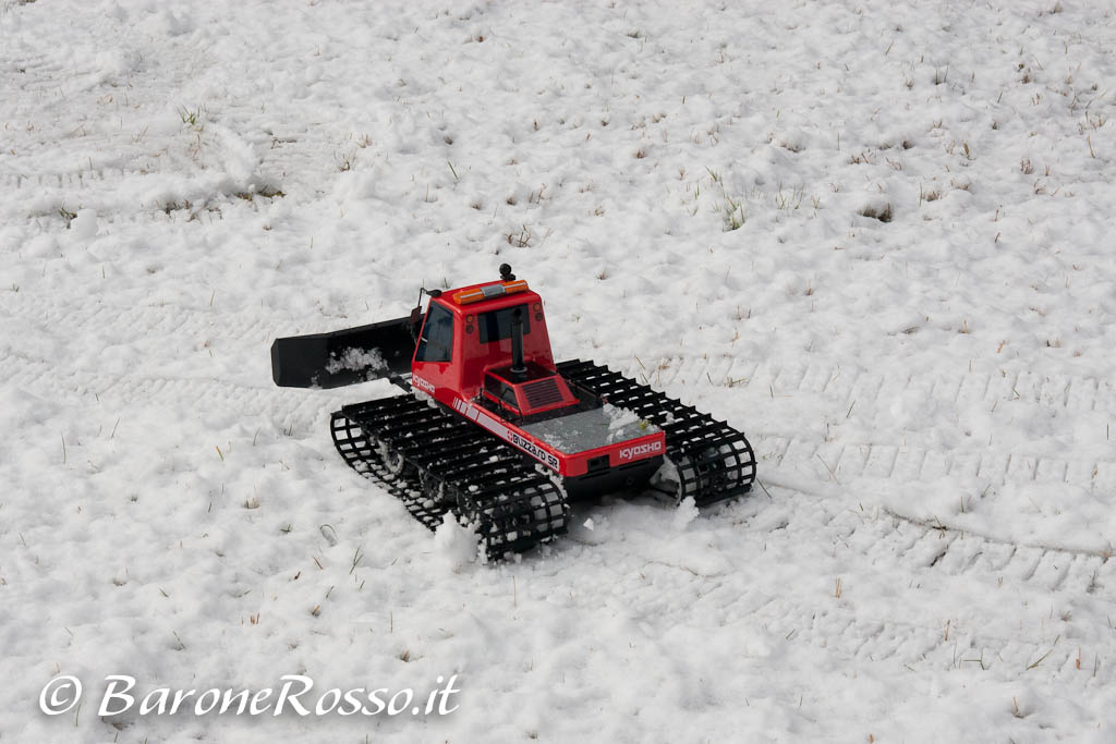Il Blizzard SR è una bella semiriproduzione in scala 1:12 di un gatto delle nevi. Il modello è dotato di cingoli indipendenti alimentati da motori a spazzole controllati da un doppio regolatore di giri che ci permette di regolarne agevolmente la velocità. Le 4 ruote che supportano i cingoli sono ammortizzate tramite un sistema di molle per ogni singola ruota che si è dimostrato molto efficace. Sulla parte frontale una bella pala comandata da un servocomando ci permette di spianare la strada.