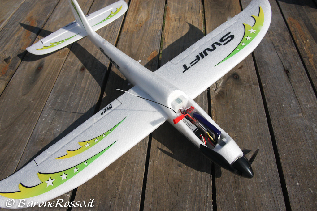Il piccolo Swift è realizzato interamente HypoDur, l'EPP della Hype, con l'ala rinforzata da un robusto longherone in carbonio. A discapito delle sue dimensioni il modello nasce completo di tutti i comandi, un servocomando da 9gr affogato nell'ala si occupa dei 2 alettoni, mentre 2 piccoli servocomandi da 4 gr controllano profondità e direzione.