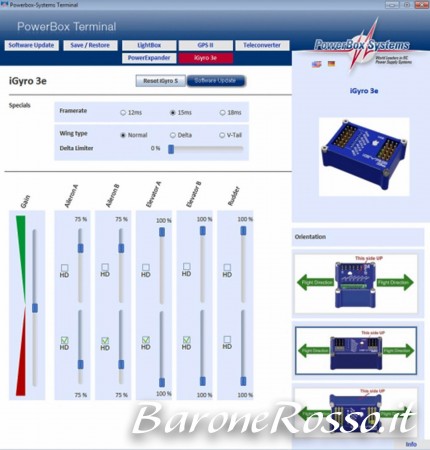 La modalità Heading ad esempio può essere utilizzata per il decollo e l'atterraggio ottenendo un modello insensibile a colpi di vento anche laterale. Gli intervalli di regolazione sono facili da settare grazie ad un cavo Usb collegato ad un Pc ed il software gratuito Powerbox terminal; con questo software si può inoltre regolare l’effetto del giroscopio su ogni asse.