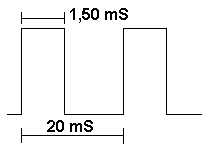 Per pilotare un servocomando occorre inviare all'apposito piedino un segnale ad onda quadra che viene decodificato da un apposito integrato all'interno del servo. Il segnale ha un periodo di 20mS e un'ampiezza di 4,8/6Volt (dipende a quanto alimentate il ricevitore o il circuito), variando l'ampiezza dell'impulso si comanda la rotazione del servo. I valori solitamente variano tra 1,25mS e i 1,75mS (l'intervallo può comunque variare leggermente tra marche diverse), con il valore 1,50mS (per i servi Multiplex è 1,60mS) si ottiene la posizione centrale del servo. |