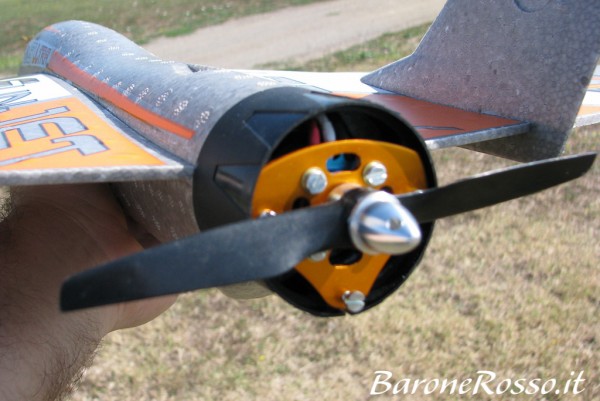 Grazie al buon sistema di raffreddamento dinamico, composto da 2 generose entrate sul muso e sulla parte finale della fusoliera, batterie, motore e regolatore non raggiungono temperature eccessive durante il loro uso, consiglio comunque di praticare con un taglierino un piccolo taglio sul rivestimento del regolatore in modo da permettere all'aria di investire direttamente le alette del regolatore. |