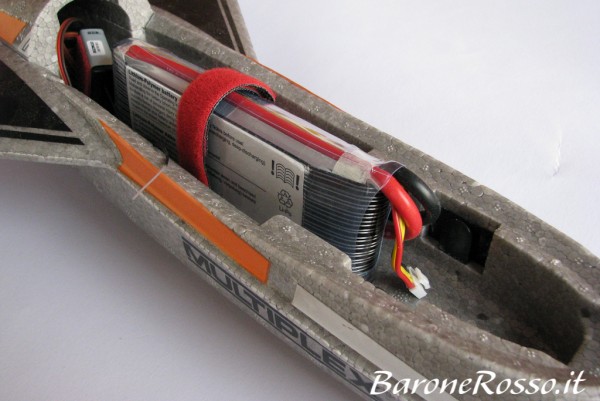 Il grosso pacco batterie da 3200mAh occupa interamente la parte frontale del nostro FunJet Ultra, muovendo il pacco avanti ed indietro possiamo intervenire sul bilanciamento del modello, il pacco viene poi fermato in posizione sia attraverso una striscia di velcro che tramite una seconda cinta sempre in velcro. |